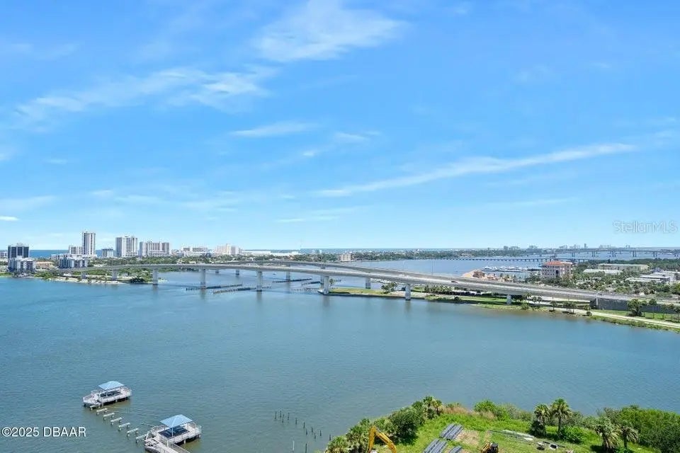 Welcome to your dream river views on the 15th floor! This beautifully renovated 2-bedroom plus office, 2-bath condo offers a perfect blend of modern elegance and serene waterfront living. Step inside to a light-filled layout with luxury vinyl plank flooring, crown molding, and expansive sliders framing breathtaking views of the Intracoastal and three iconic bridges. The gourmet kitchen features granite countertops, stainless steel appliances, and 42-inch cabinets flowing seamlessly into the dining area with a grand chandelier. The spacious family room opens to an oversized balcony ideal for morning coffee or evening sunsets. The primary suite boasts balcony access, a custom walk-in closet, and a spa-like bath with dual vanities, jetted tub, and walk-in tile shower. The second bedroom offers river views, plush carpet, and an updated full bath. A private office/den, in-unit laundry, and pristine condition throughout complete the home. Enjoy maintenance free waterfront living at the fabulous MG on the Halifax and you almost never have to leave the condo! The Marina Grande is an active community, the residents are offered Yoga Classes, Poker Night, Monday Night Football, Coffee Time, Movie Night, Mahjong, Thursday's Food Truck Night, and Grill & Chill with your neighbors. This is More Than a Home; It's the Embodiment of the Florida Lifestyle. Pet-Friendly and Just Minutes from Downtown Daytona Beach, The World's Most Famous Beach, NASCAR Races, and Endless Outdoor Activities. Don't Miss Out on This Incredible Opportunity!